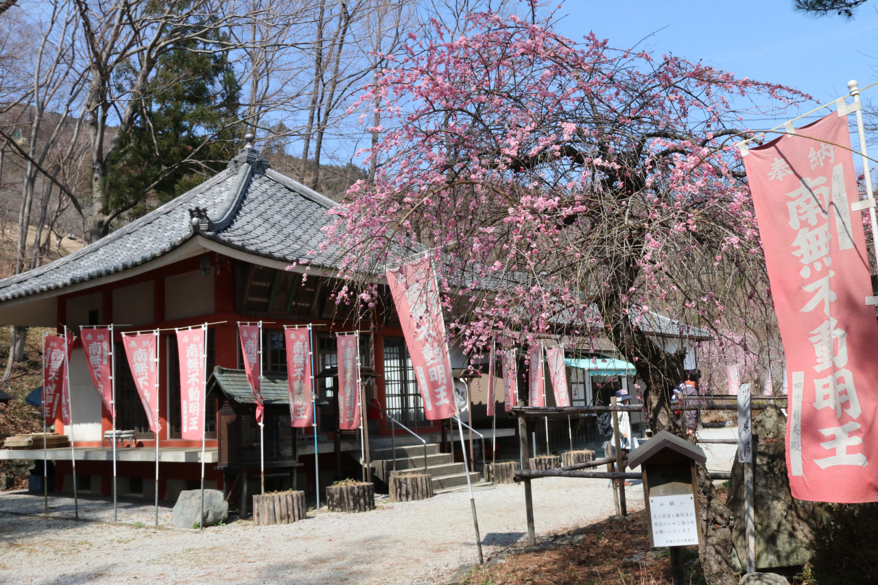 宝登山山麓にある不動寺には、様々な種類のしだれ梅が約150本咲き誇ります。