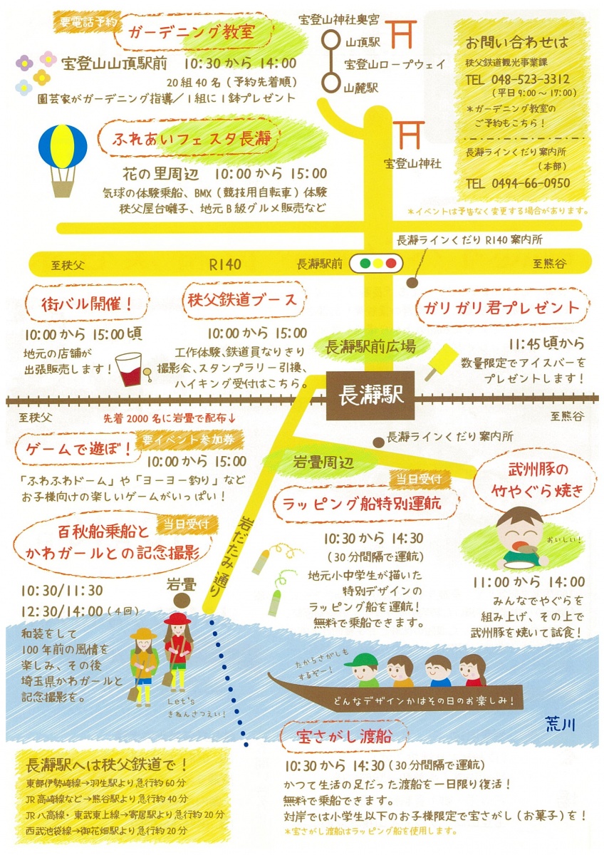 「長瀞ラインくだり」100週年を記念して、長瀞ラインくだり史上初のラッピング船(地元の小学生が描いた特別デザイン)の特別運行、かつての生活の足だった渡船の体験とお子様向けの宝さがし、ガーデニング教室、武州豚の武やぐら焼きなどなど・・・