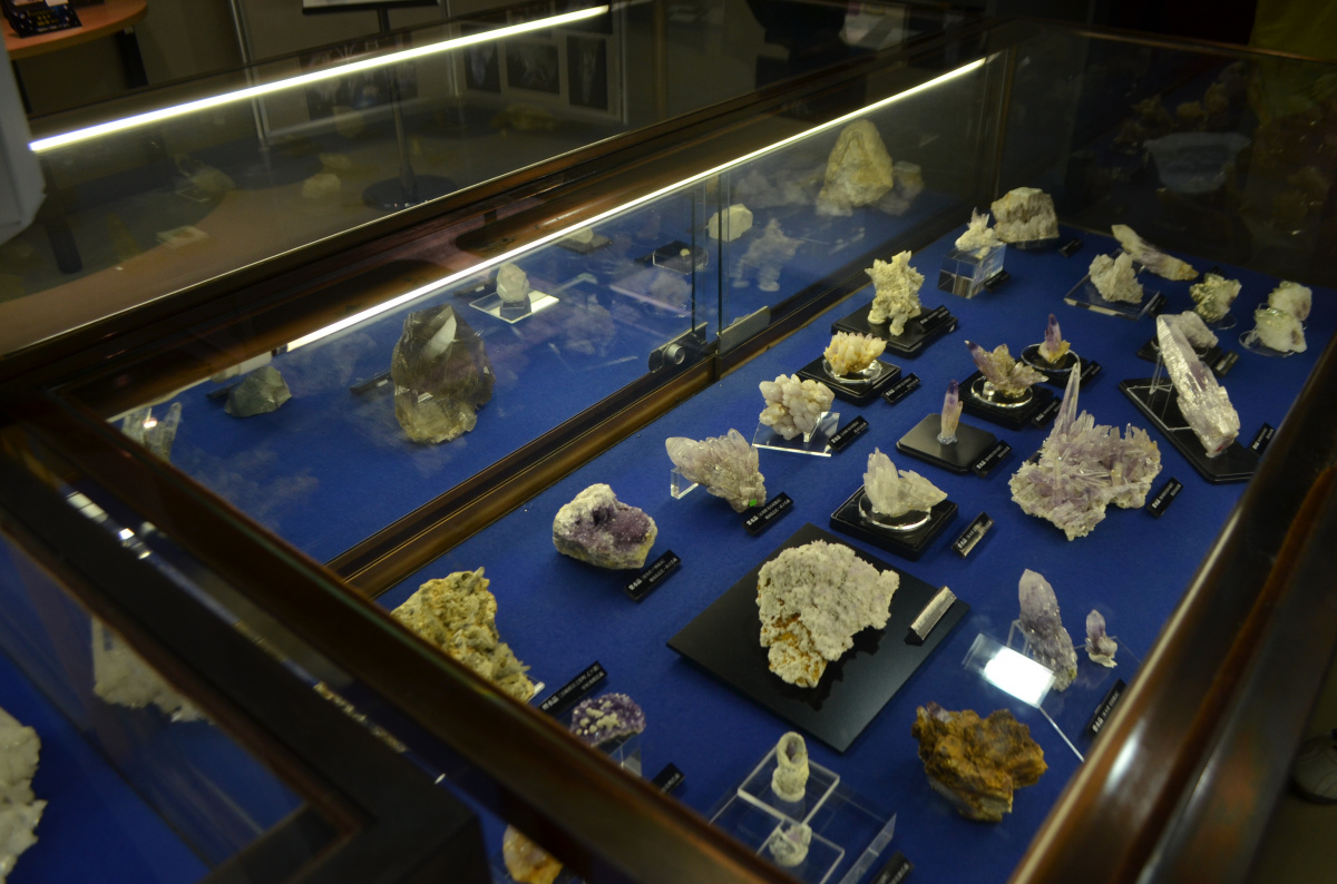 様々な色や形の珍しい水晶のほか、水晶の仲間の鉱物であるオパールやメノウなどの展示も行っています。