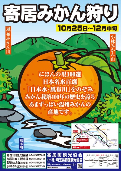 2020年10月24日 寄居みかん狩り(風布・小林)開園 長瀞観光情報 寄居町の風布みかん山・小林みかん山が、 2020年10月25日よりオープンいたします。 詳細は、寄居町観光協会のホームページをご確認ください。