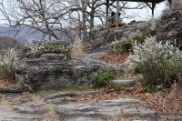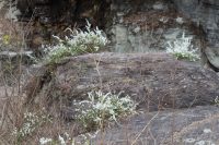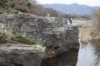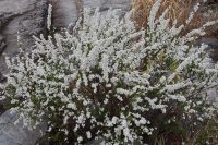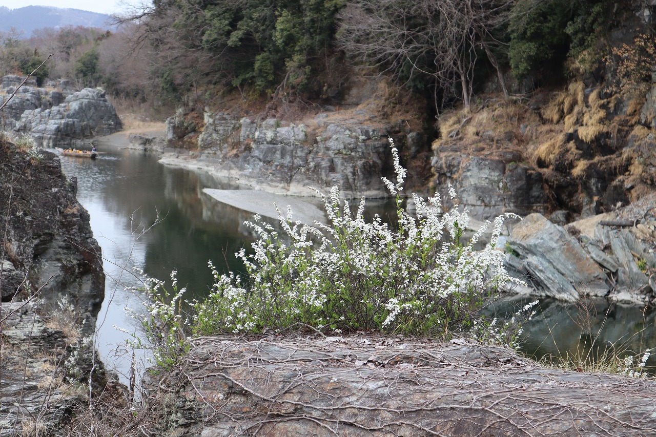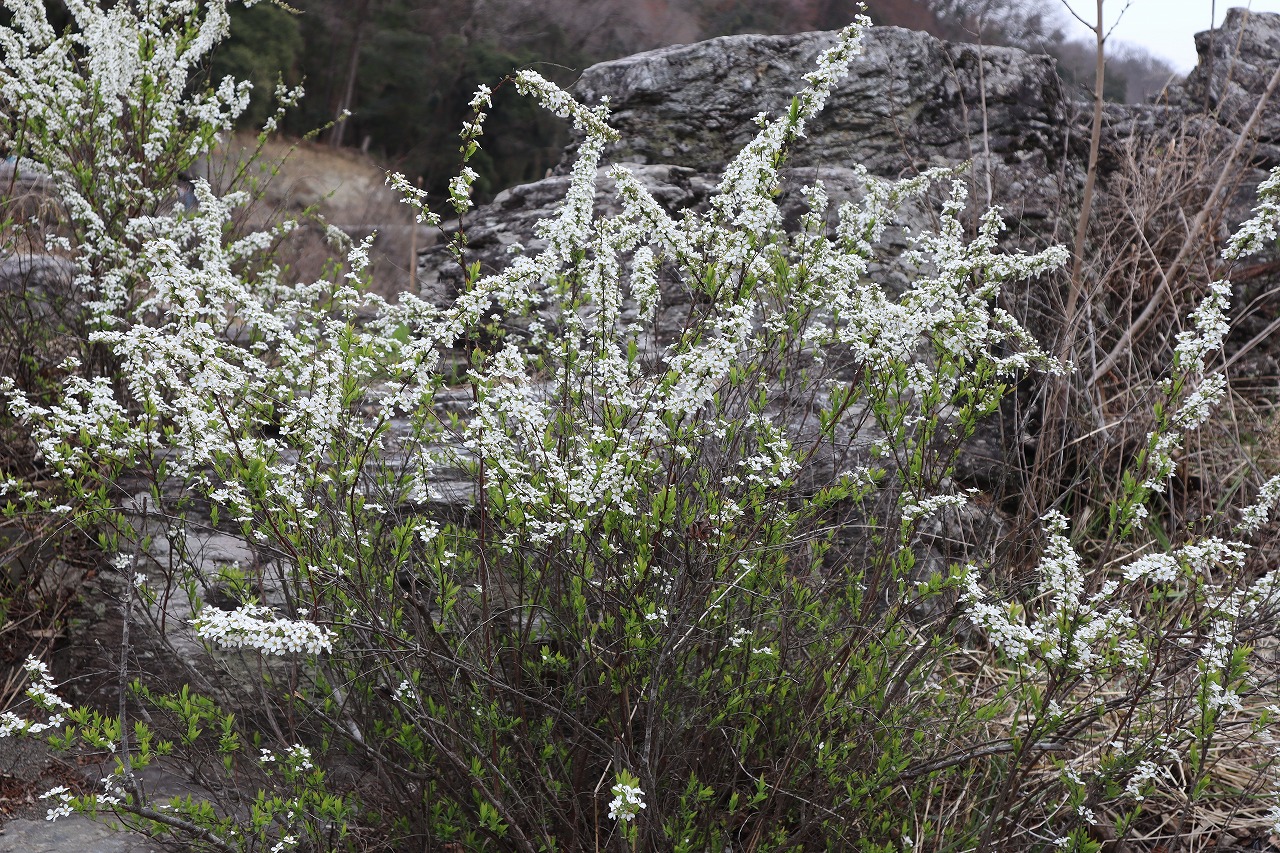 岩畳に自生しているユキヤナギが見頃を迎えています。