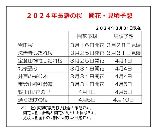 2024年3月31日 長瀞「ソメイヨシノ」開花 長瀞観光情報 桜情報 花情報 長瀞のソメイヨシノが、3月31日に開花をいたしました。 長瀞に本格的な「桜のシーズン」が到来です。 井戸の桜並木・北桜通り・宝登山参道・・・開花 野土山/花の里・・・4月1日開花予想 見頃予想は、4月4~5日位になりそうです。