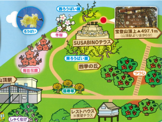 2026年2月24日 【宝登山】ロウバイ 開花状況 2026.2.24 長瀞観光情報 梅情報 花情報 ロウバイ情報 宝登山のロウバイと梅の開花状況をお知らせいたします。 場所については下図をご参考ください。 (引用:宝登山ロープウェイ パンフレット) 西ロウバイ園・・・見頃。 東ロウバイ園・・・見頃。 四季の丘・・・見頃。 福寿草・・・SUSABINOキッチン前に咲いている花が増えてきました。 梅百花園・・・2~3分咲き。 不動寺のしだれ梅・・・2~3分咲き。手前はかなり咲いてきました。