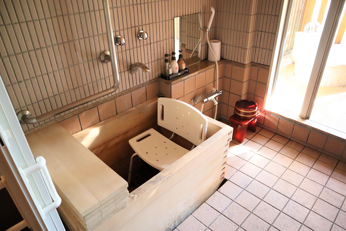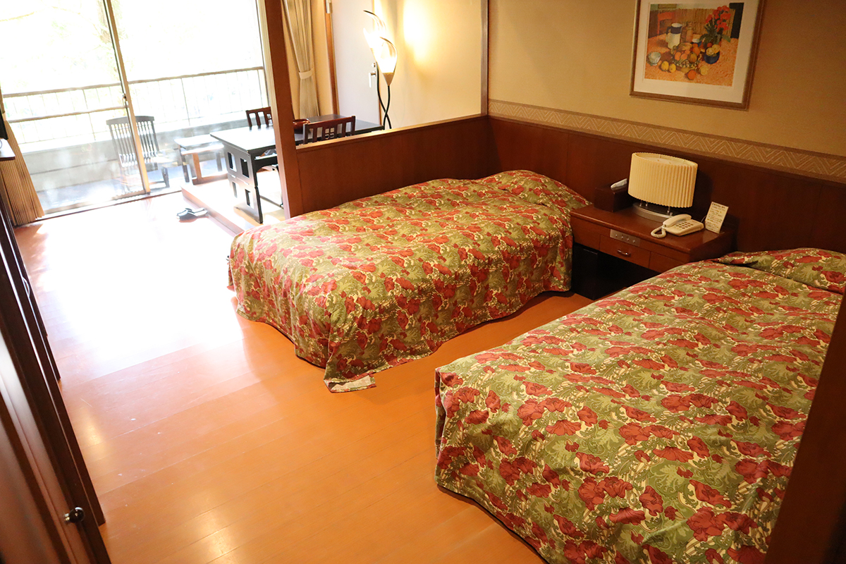 ツインベッドのバリアフリー準対応のお部屋で、車いすのまま入室可能です。露天風呂付客室となっており、また、隣のお部屋とも行き来できるコネクティングルームとしても利用可能なので、ご家族やご仲間などみなさまでお過ごしいただけます。