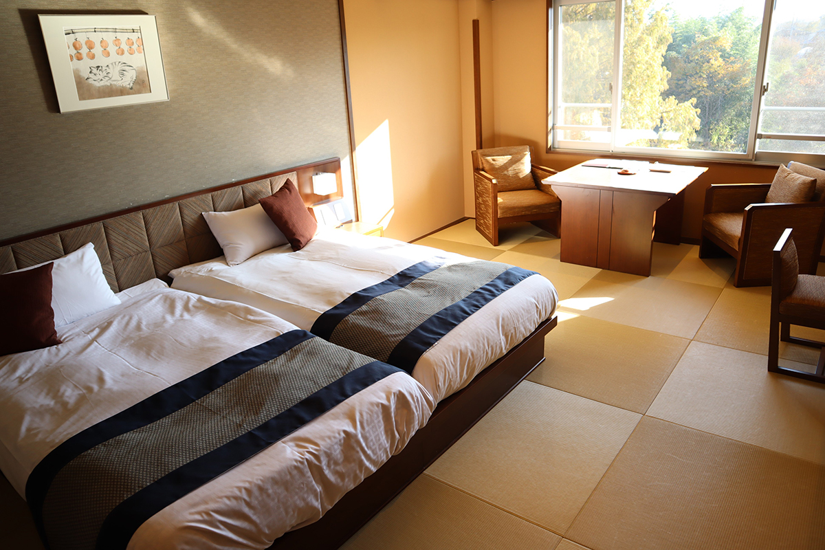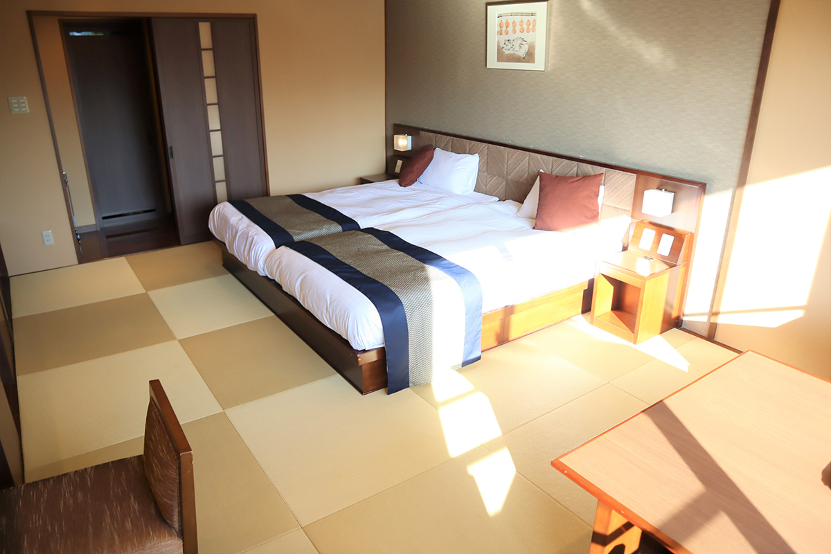 畳の上にベッドが設置された和モダンのお部屋です。落ち着いた雰囲気でごゆっくりおくつろぎいただけます。