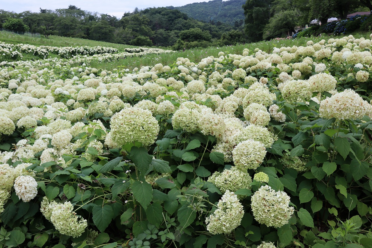 花の里 長瀞のアナベル・アジサイ・ハナビシソウの開花状況です。