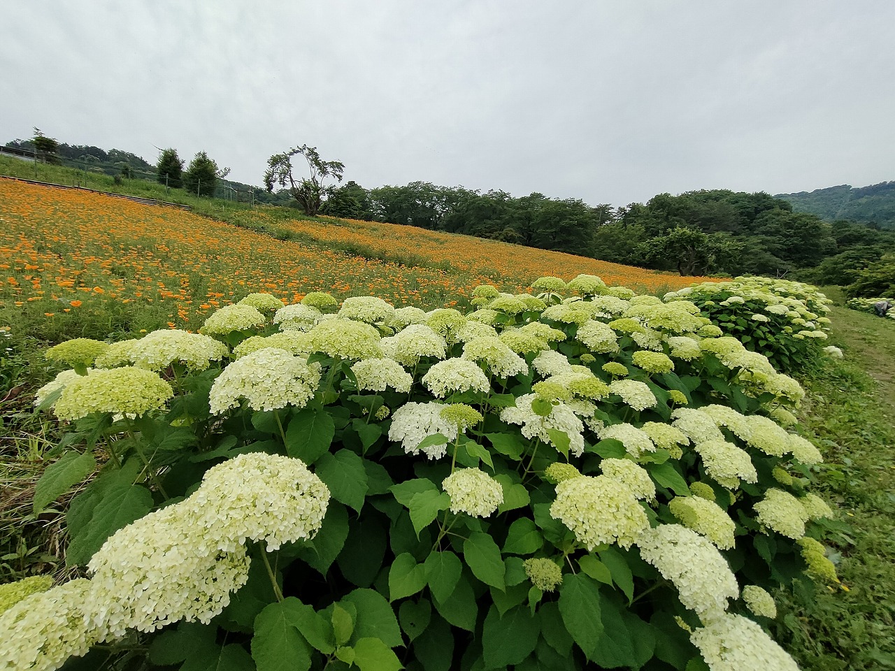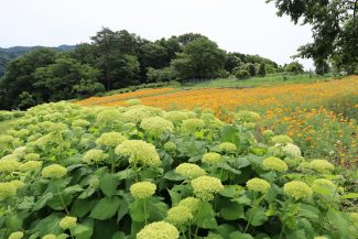 2024年6月10日 アナベル開花状況 2024.6.10 アジサイ 長瀞観光情報 花情報 6月10日午後の、アナベルの開花状況です。 ライトグリーンの中に、淡い白色の花が増えてきました。 アナベルの全体の約4割近くが開花しております。 今しか見られない、ハナビシソウとのコラボレーションをどうぞお楽しみください!