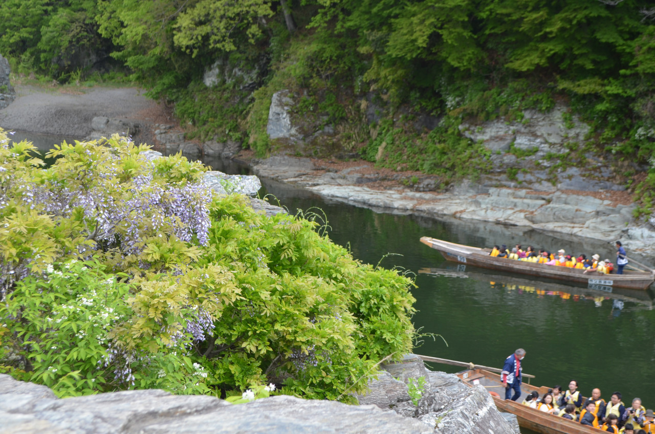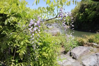 岩畳周辺は、古くから、藤が多く自生していたことから、このあたりを「藤谷淵」(ふじやぶち)と呼んでいました。今なら、川下りしながら藤や新緑を眺めることができます。