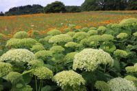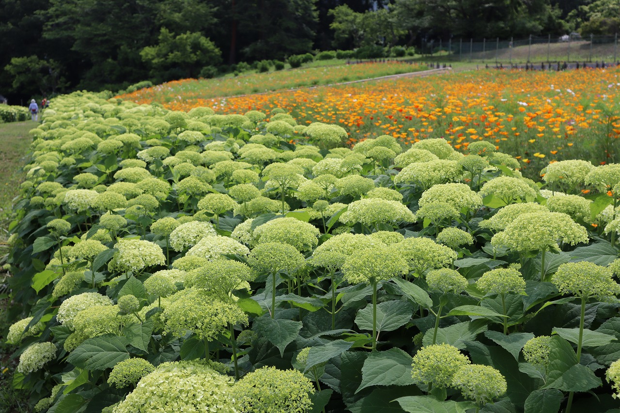 2024年6月10日 アナベル開花状況 2024.6.10 アジサイ 長瀞観光情報 花情報 6月10日午後の、アナベルの開花状況です。 ライトグリーンの中に、淡い白色の花が増えてきました。 アナベルの全体の約4割近くが開花しております。 今しか見られない、ハナビシソウとのコラボレーションをどうぞお楽しみください!