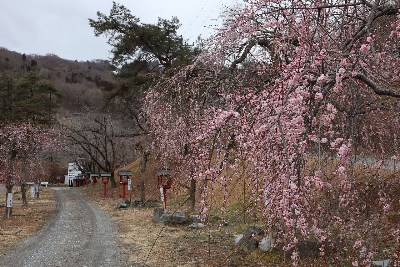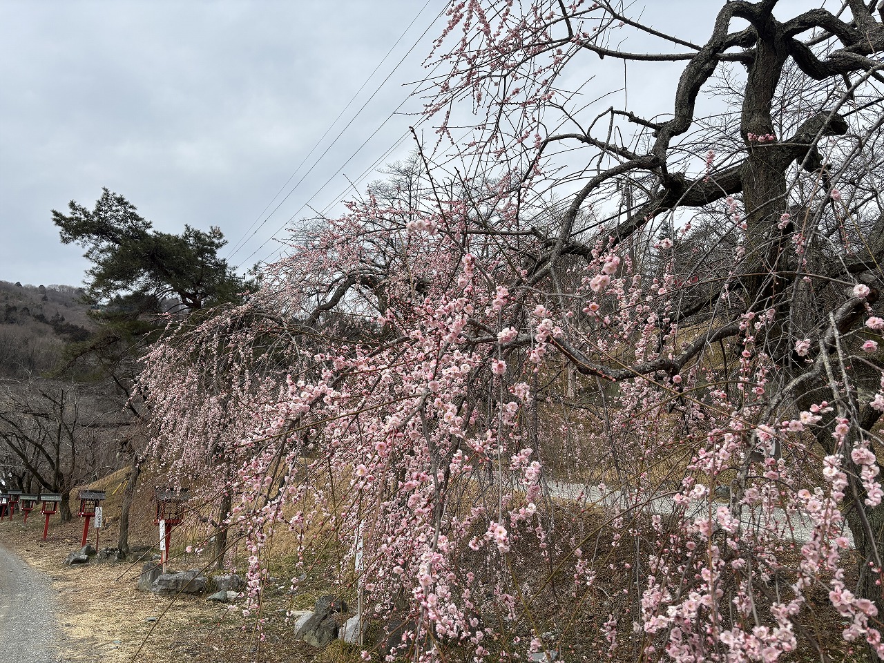不動寺のしだれ梅・・・3~4部咲き、木によっては見頃迎えています。