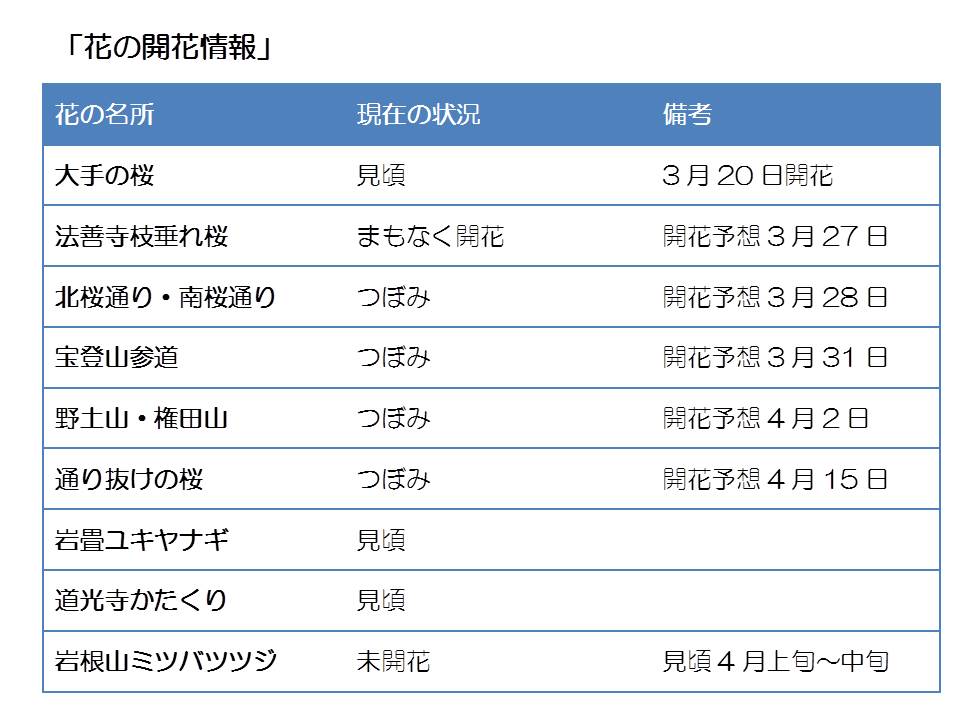「岩畳ユキヤナギ」「道光寺かたくり」「大手の桜」が共に、3~5分咲きです。