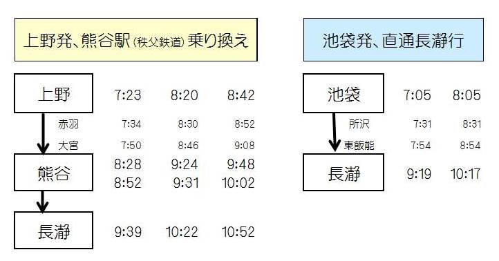 ・・・上野駅―(高崎線経由)-熊谷駅乗り換え-(秩父鉄道)-長瀞駅