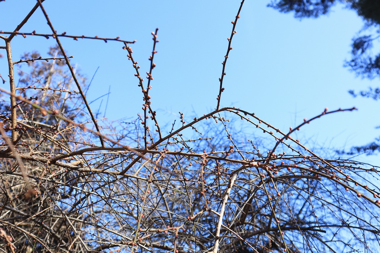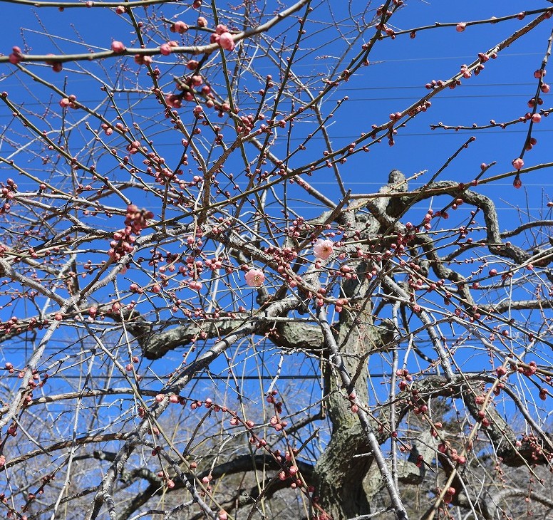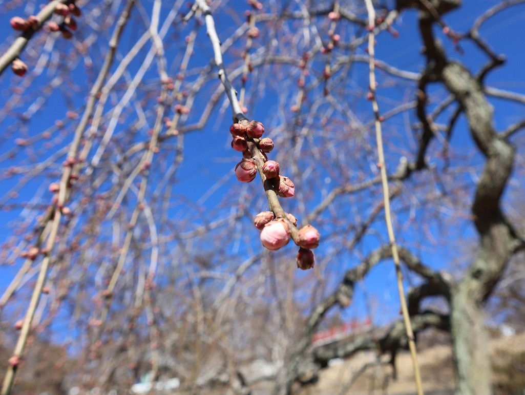 不動寺のしだれ梅・・・全体的につぼみですが、一部開花が進んでいます。