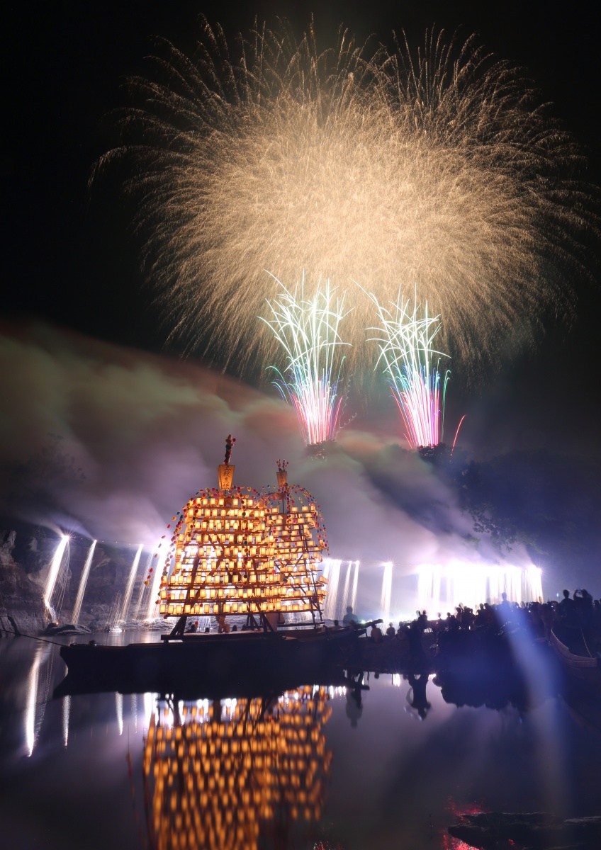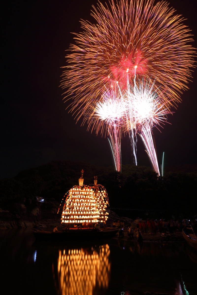 約1000基の灯篭流しと川面に光る万灯船はとても幻想的で、対岸から打ち上げられる約3500発の花火は頭上に大きく咲き、渓谷に響き渡る音とその迫力に、訪れた約8万人の観客からは大きな歓声と拍手があがりました。