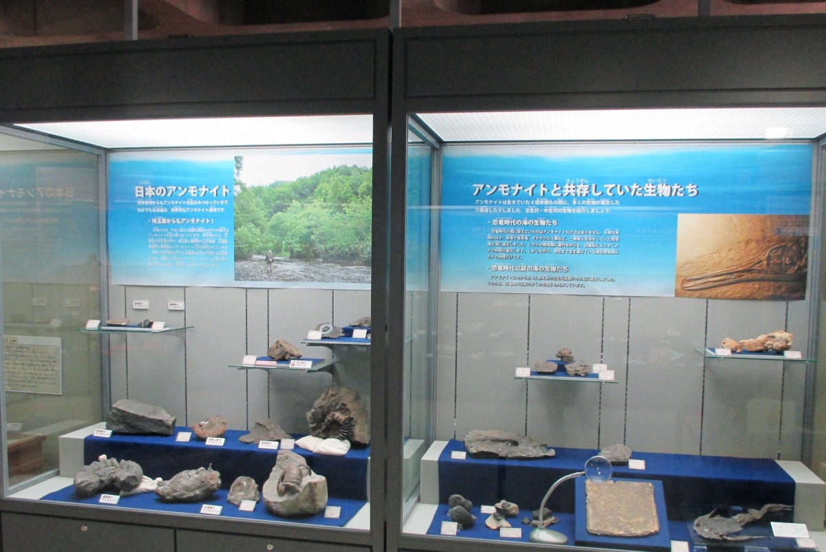 1階には恐竜の化石が3体、2階では色々な種類のアンモナイトの化石を展示しております。