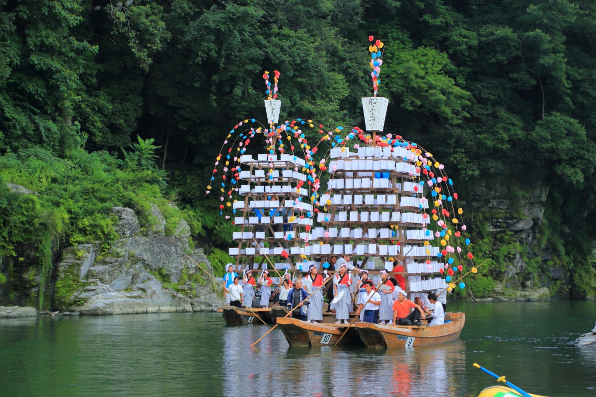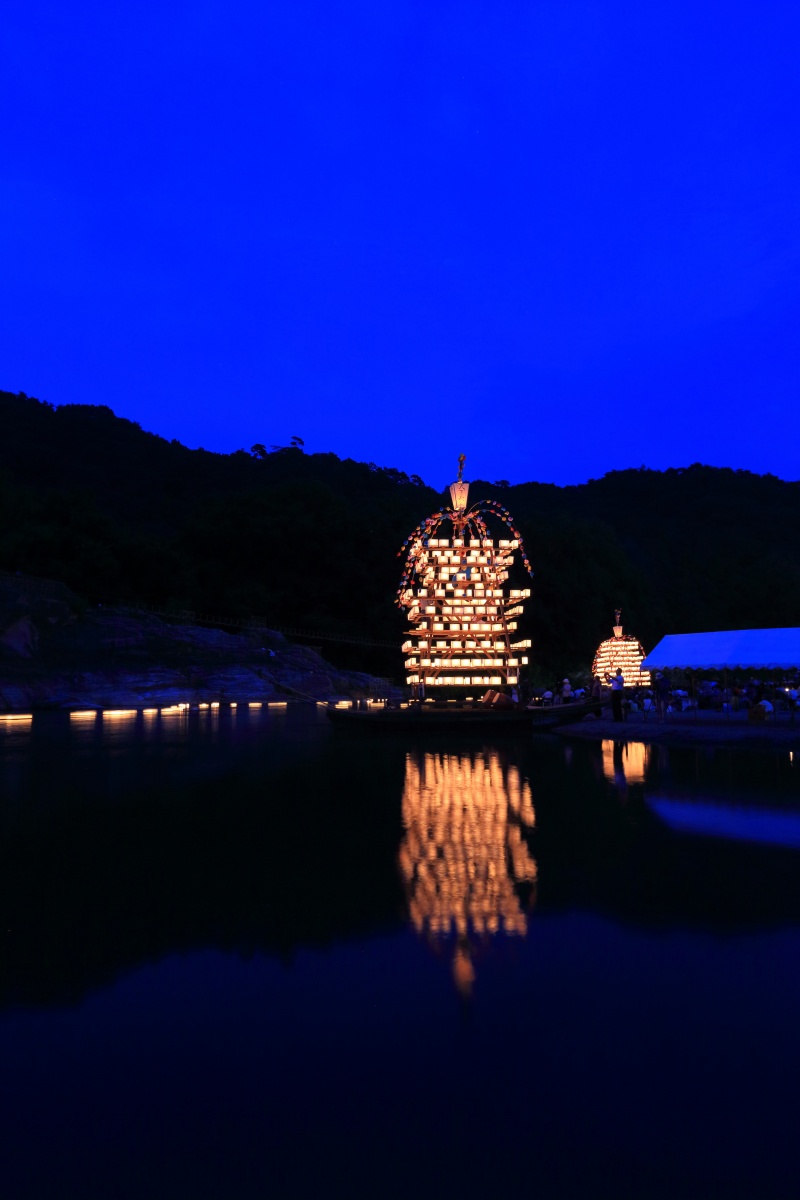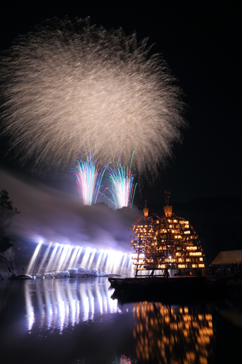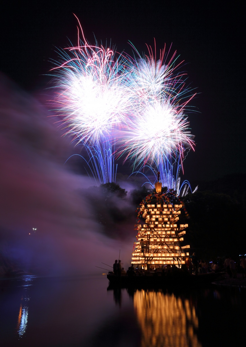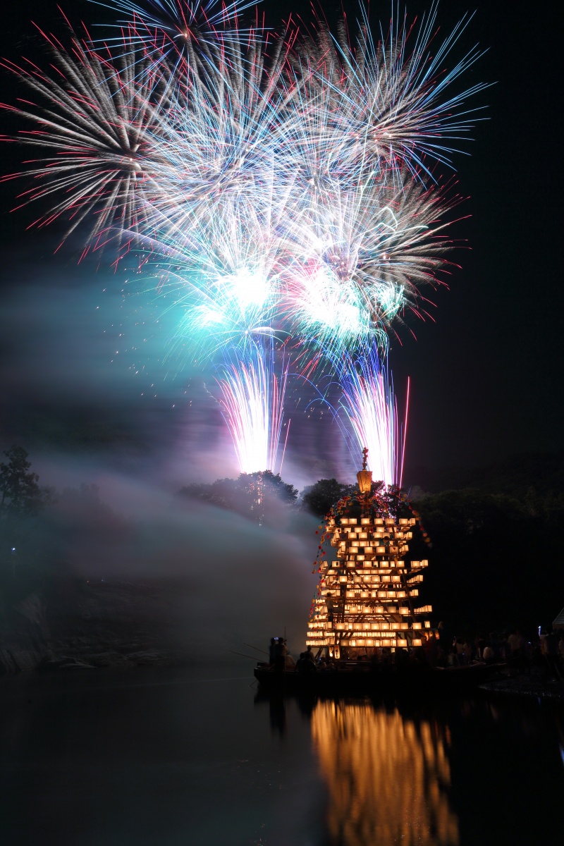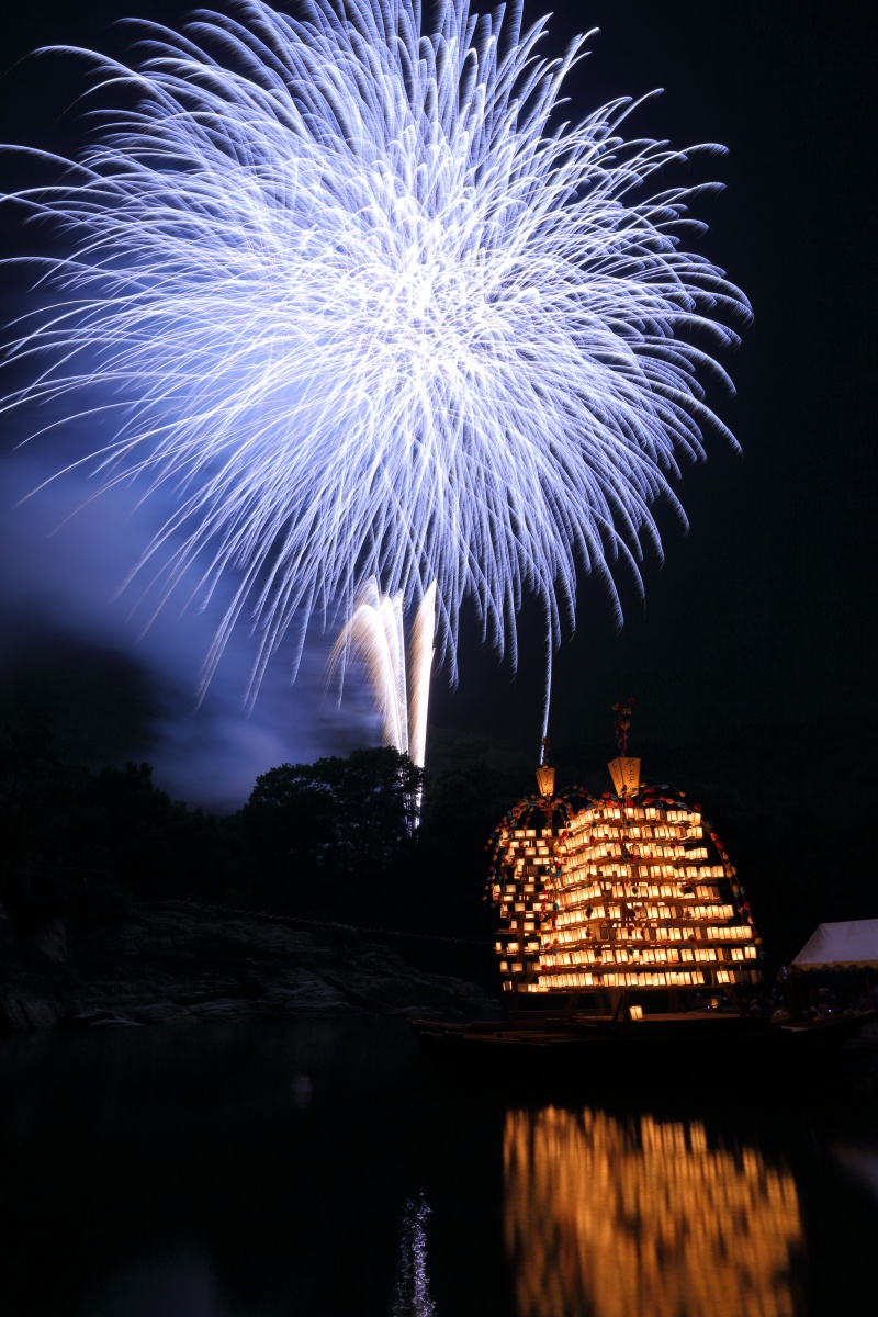 2014年8月20日 船玉まつりの写真をUPしました。 トピックス 8月15日(金)に長瀞船玉まつりが岩畳周辺で行われました。 100年以上続くこの船玉まつりは、船下り の船頭が水上の安全を祈願して水神様をお祀りしたのが始まりとされています。 約1200基の灯篭流しと川面に光る万灯船はとても幻想的でした。 19時半頃からは対岸から約3500発の花火が打ち上げられ、その迫力と色とりどりの花火に、訪れた7万人の観客から大きな歓声と拍手があがりました。