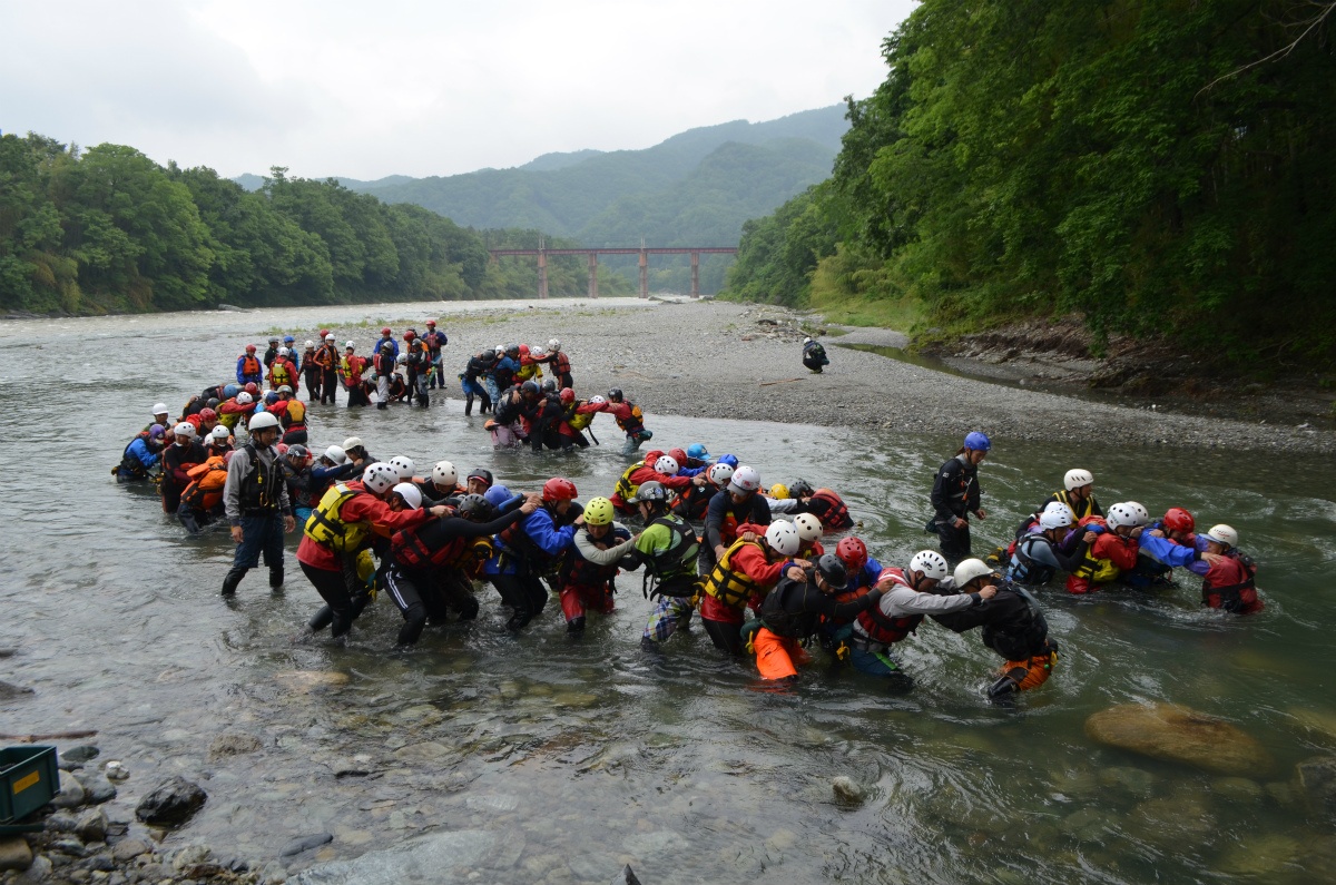 船頭やリバーガイド、警察官や消防士が一緒になり、ラグビーのようにスクラムを組んで、川を渡る方法も訓練しました。