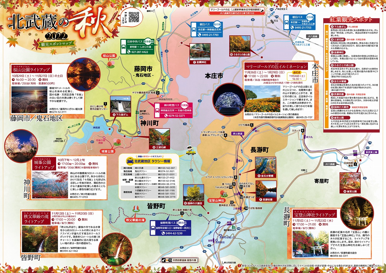 北武蔵地区観光連絡会では、「本庄市」「神川町」「藤岡市鬼石地区」「皆野町」「長瀞町」の5つの地域の秋の観光情報をご紹介しております。