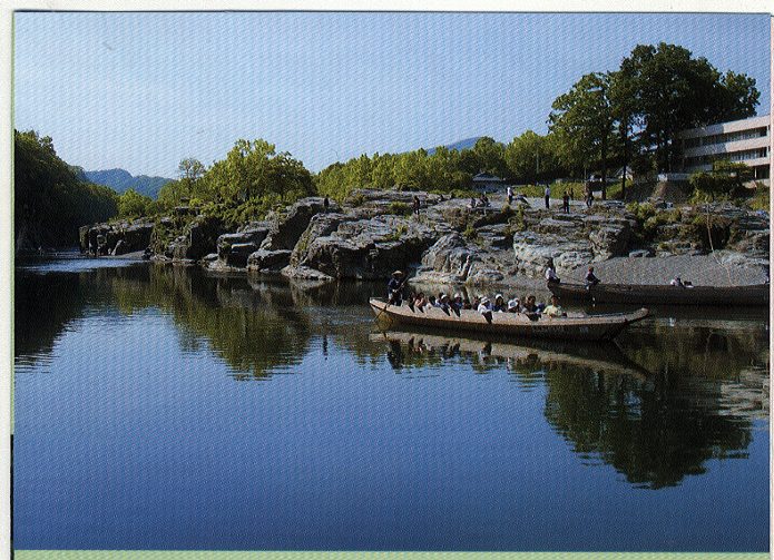 宿からライン下り発着場が見えています。 岩畳と渓流を眺めながら川魚料理を召上ってください。