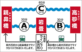 ● Aコースの出発地点(親鼻橋)へはライン下り案内所前からバスでお送りいたします。