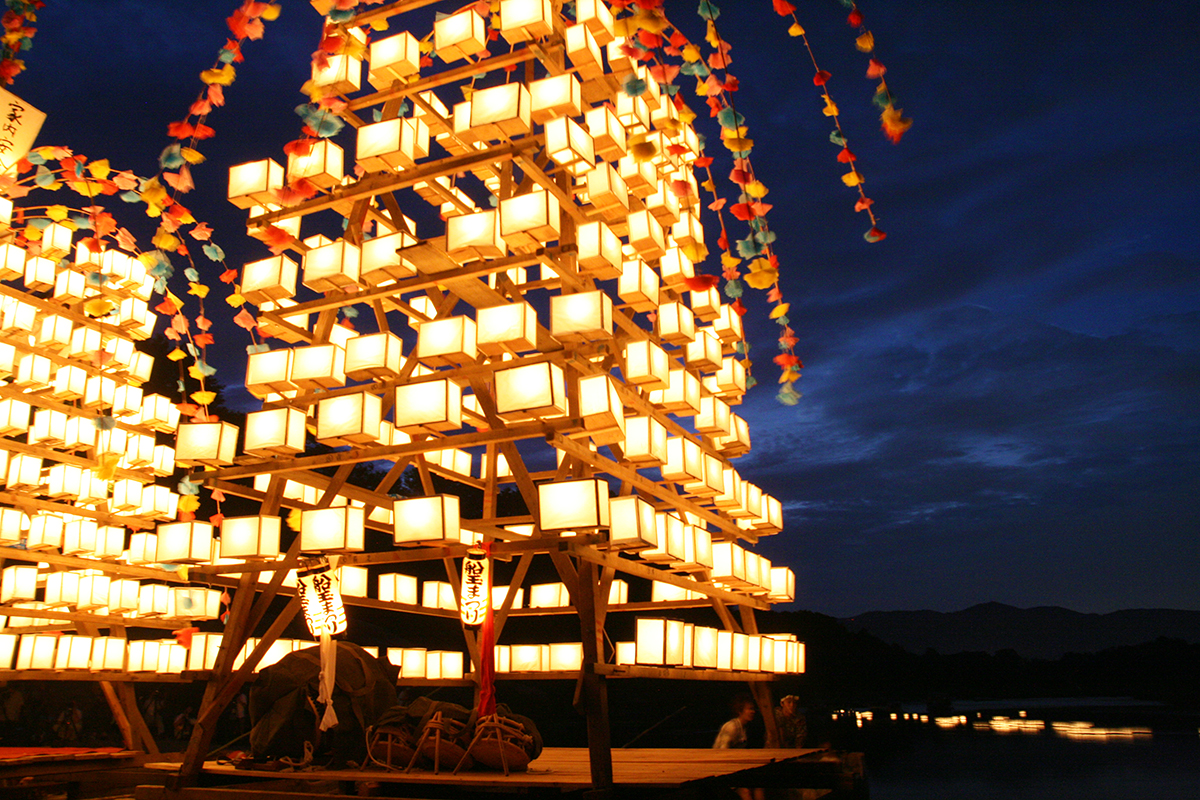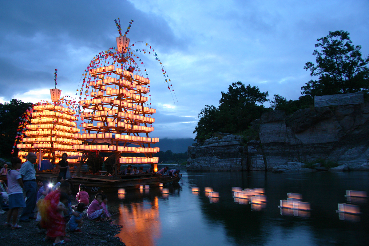 長瀞船玉まつり明治の末頃遊船の船頭が水神様を祀り、水上安全と水難供養を行ったのがこの祭りの起源であるといわれている。 船玉祭りは、船の安全を祈願して祀る船霊からその名があるといわれる。 祭り当日は、神前で祝詞奏上の後寶登山神社の神官が船に乗り、清流で清め祓いを行うと、二隻の万灯船が屋台囃しの演奏とともに瀞をゆるやかに上下する。 その一方でたくさんの灯籠が流され、水の犠牲になった人びとの供養が行われる。 対岸の岩上では、仕掛け花火やスターマインが打ち上げられ、祭りはクライマックスに達する。