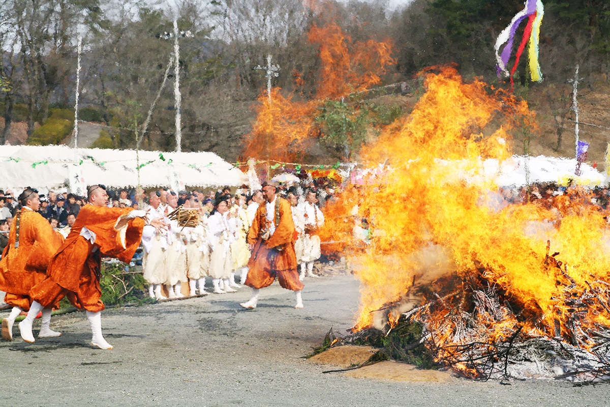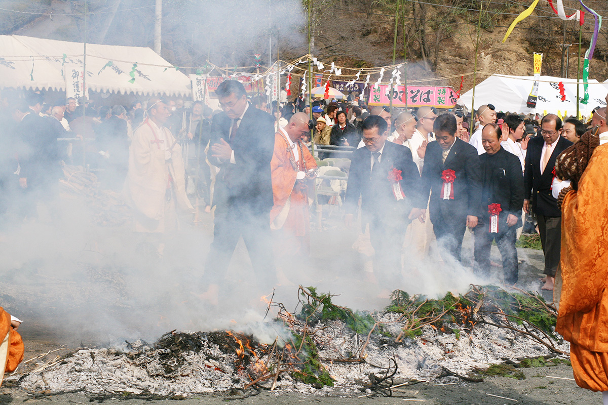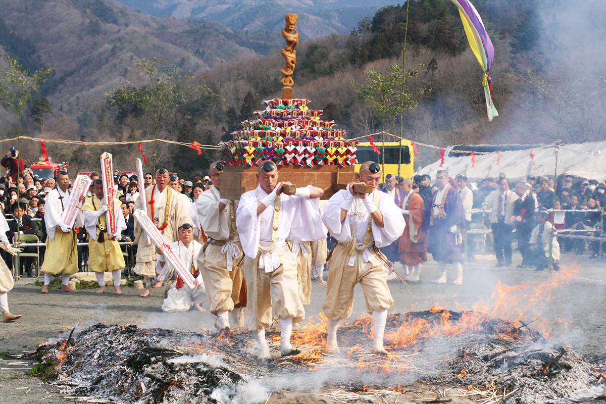この祭りは、真言宗の総本山醍醐寺座主、三宝院門跡御親修の柴燈大護摩による火渡荒行。 火渡りは、宝登山ロープウェイ山麓駅下の駐車場で行われ柴燈大護摩の火渡りに続き、修験者による火渡りが執行される。 この護摩の浄火を渡ることによって一切の災難と障害を焼き滅ぼし、「宝福招来」「開運厄除」のご利益がもたらされるといわれている。