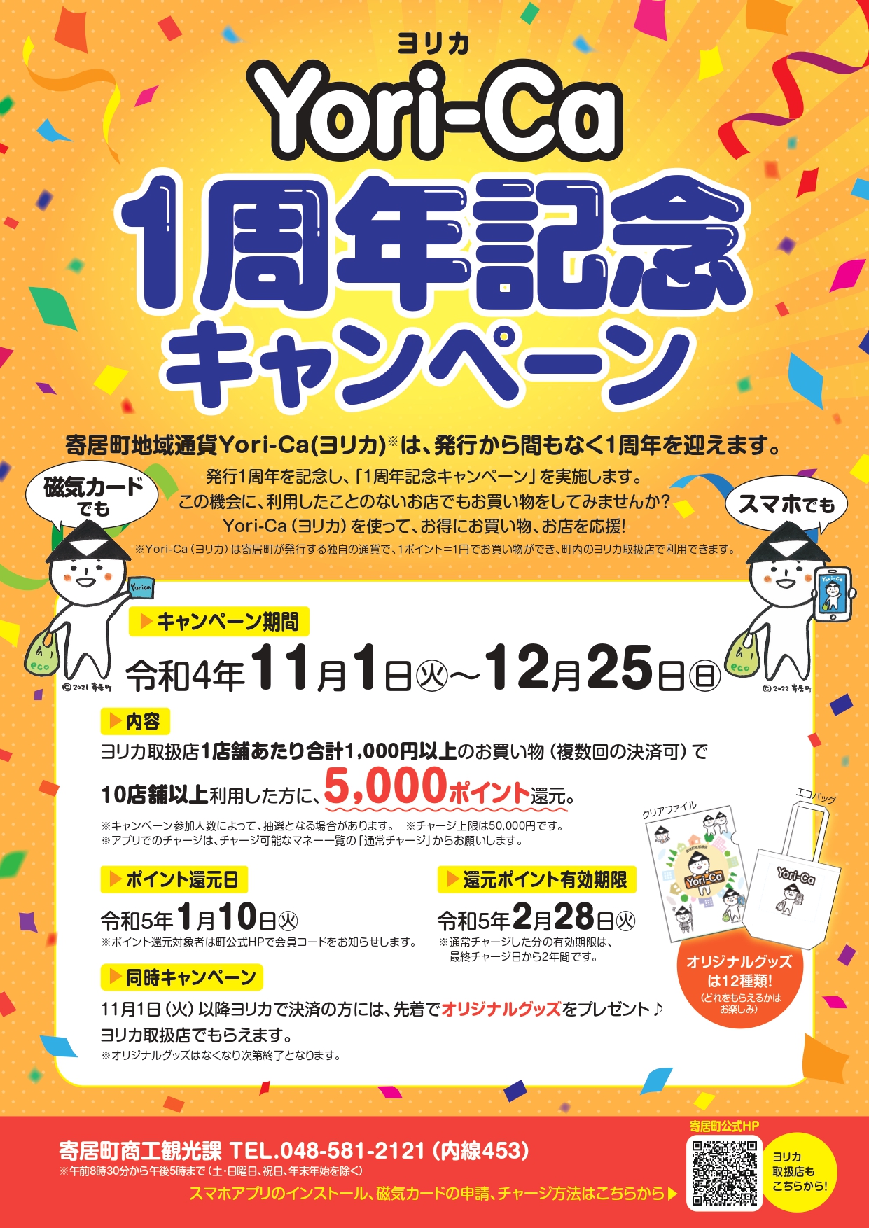寄居町地域通貨Yori-Ca(ヨリカ)の発行1周年を記念し、「1周年記念キャンペーン」を実施します。