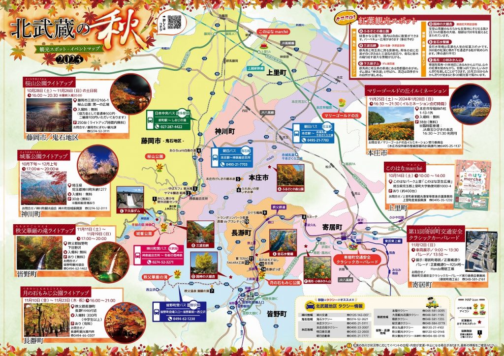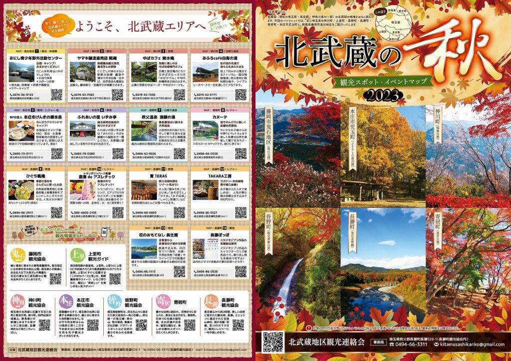 皆野・長瀞・寄居・本庄・上里・神川・鬼石地区で構成する「北武蔵地区観光連絡会」は、地域の秋の見どころ・イベントの情報をまとめた、「北武蔵の秋2023」を発行いたしました。