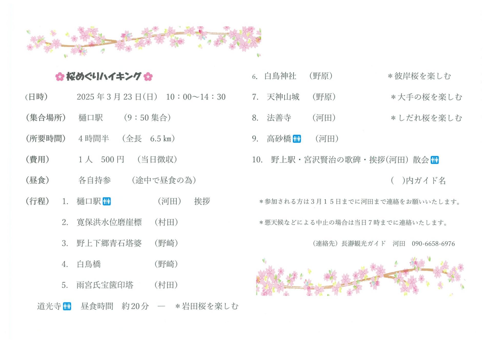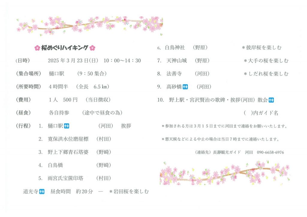 雪が降ったり風が吹いたりしながら、少しずつ季節は春に向かっていますね😊。桜の開花が待ち遠しい今日この頃です。さて!お待たせしました、皆様お待ちかねの🌸桜めぐりハイキング🌸のお知らせです👞当日は樋口駅でスタートして、そのあと長瀞の観光名所と桜の名所の6・5kmを約4時間半かけて歩きながらめぐります👣。ゴールは野上駅、長瀞が誇る宮沢賢治の歌碑の前で散会です。