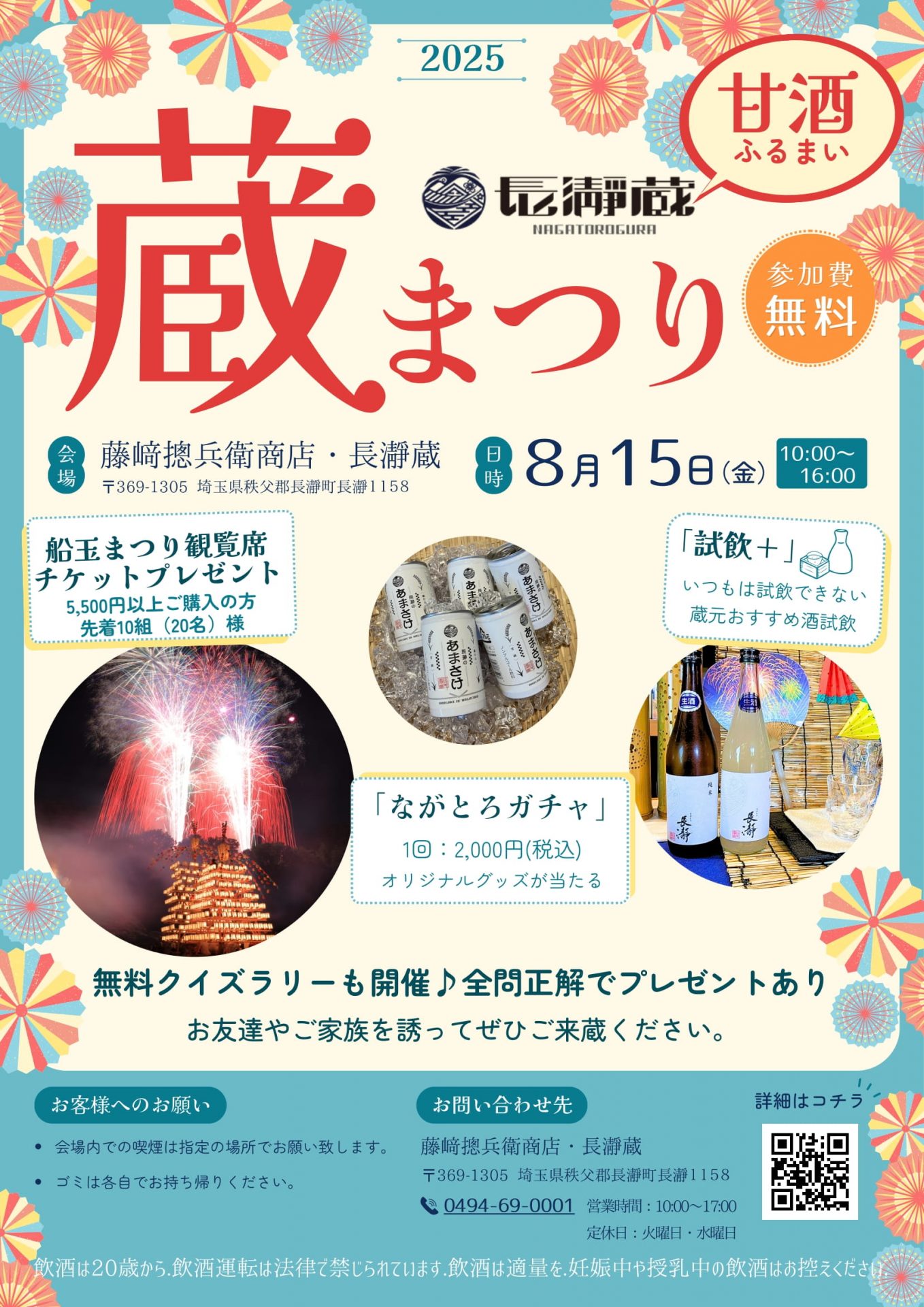 長瀞蔵にて「蔵まつり」が開催されます✨蔵元おすすめの酒試飲や2000円ガチャ、無料のクイズラリーなど沢山のイベントがあります♪