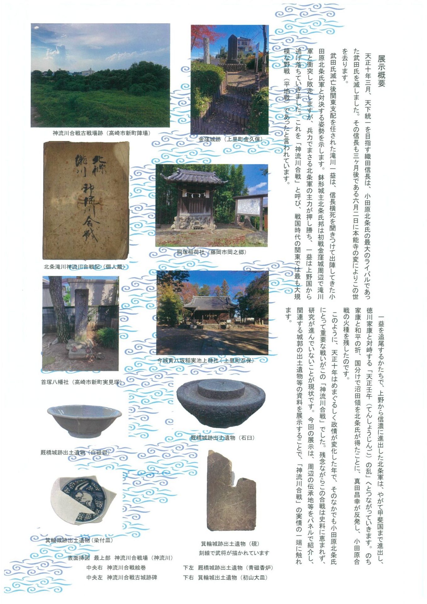 神流川合戦は史料に恵まれておらず、研究が進んでいないことが現状ですが、今回の展示は周辺の伝承地等をパネルで紹介し、関連する城郭の出土遺物などを資料を展示します。