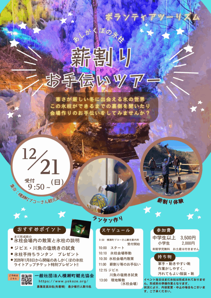 詳細・お申込みは下記リンク先ご確認ください👇あしがくぼの氷柱 薪割りお手伝いツアー - 歩楽~里(ぶら~り)よこぜ