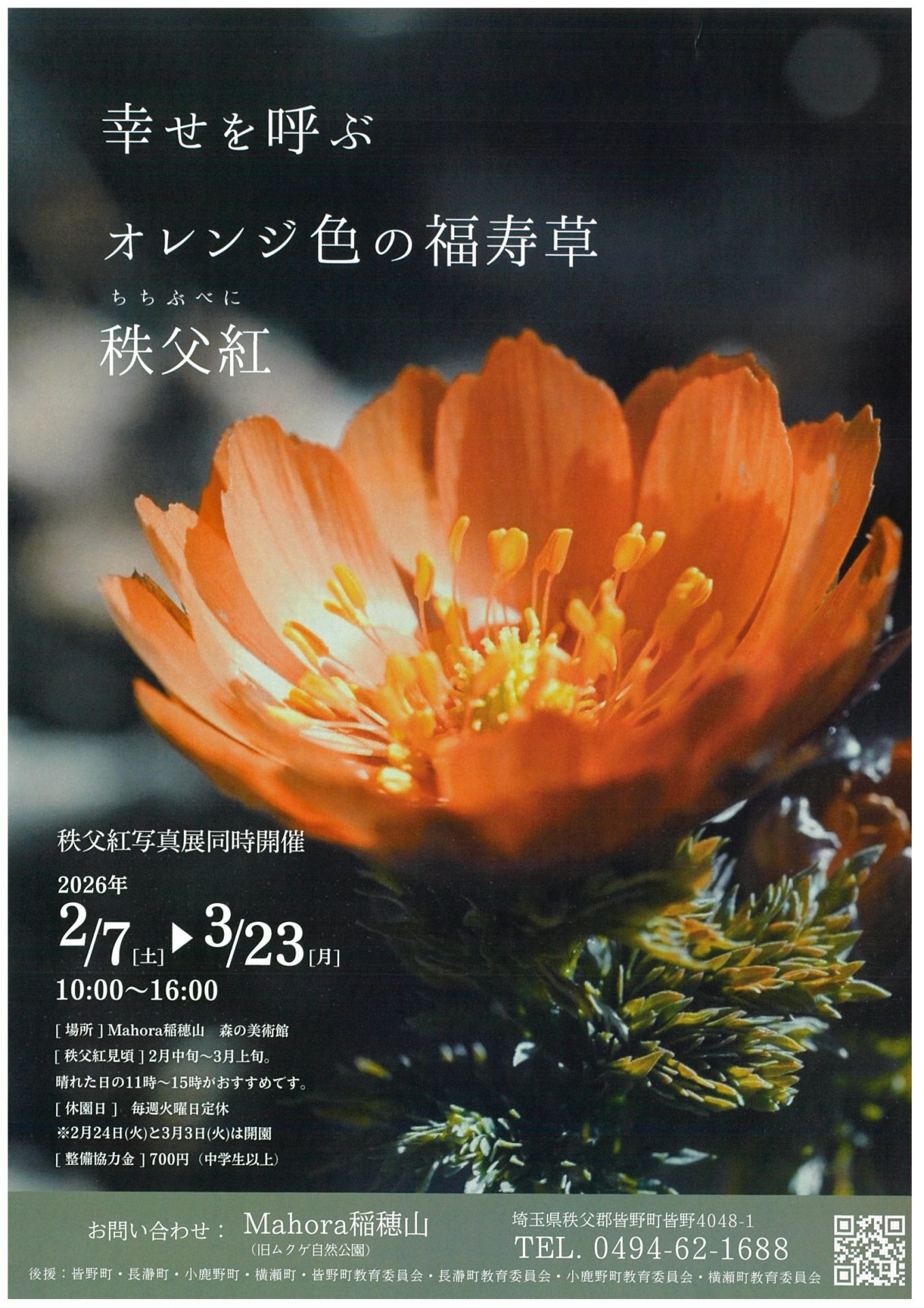 皆野町のMahora稲穂山では、2月中旬から3月上旬にかけて幸せを呼ぶオレンジ色の福寿草『秩父紅』がお楽しみいただけます。また秩父紅の写真展も同時開催されますので、どうぞお出掛けくださいね!!