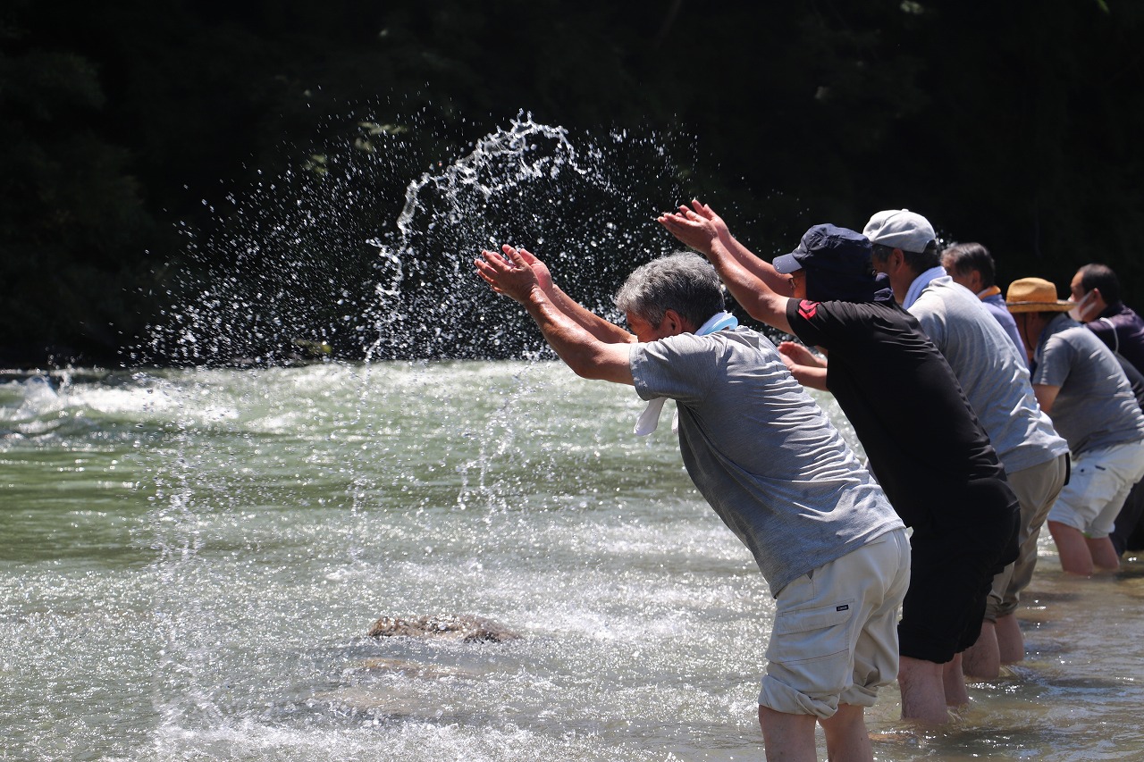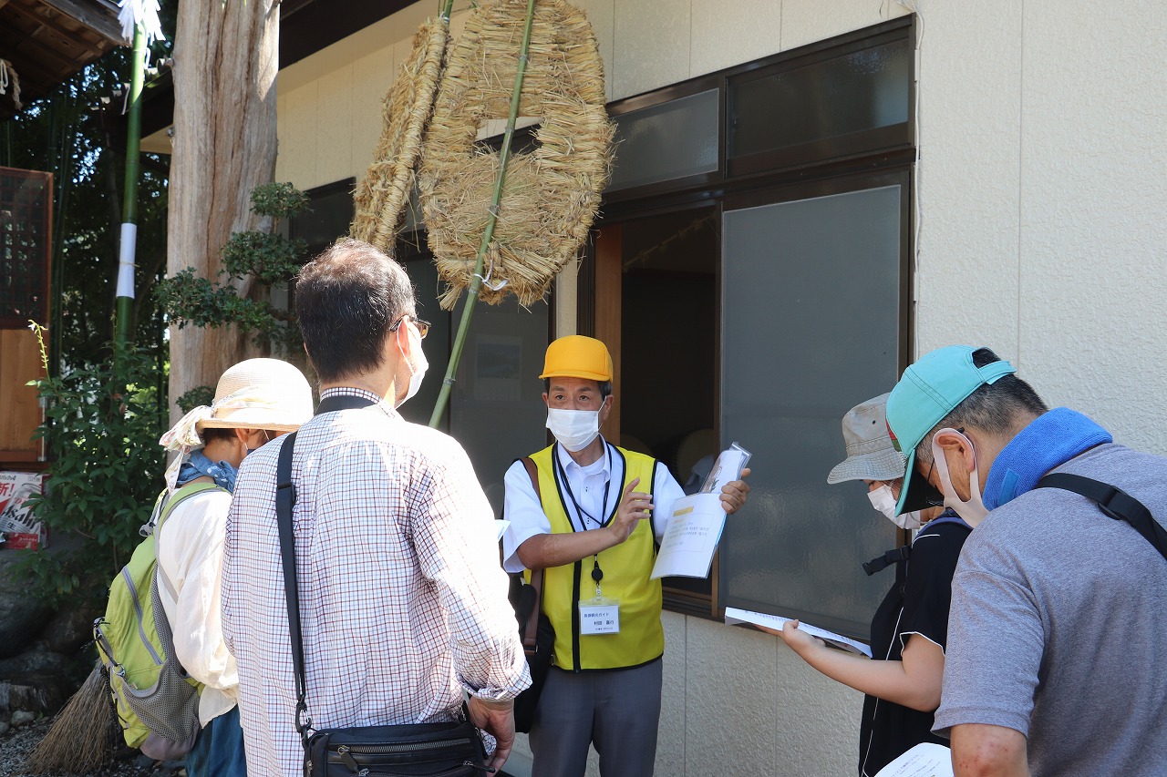 このお祭りは、悪疫退散・無病息災と大山講の神参りとして毎年実施されており、午前10時から正午までの間に祭典、大わらじの設置、千垢離(せんごり)などの各行事が行われました。このお祭りに合わせ、長瀞観光ガイドにおいて、「長瀞の夏祭り 簗瀬のお精進と特大わらじコース」と題した、一日限定のコースが初めて企画・実施されました。