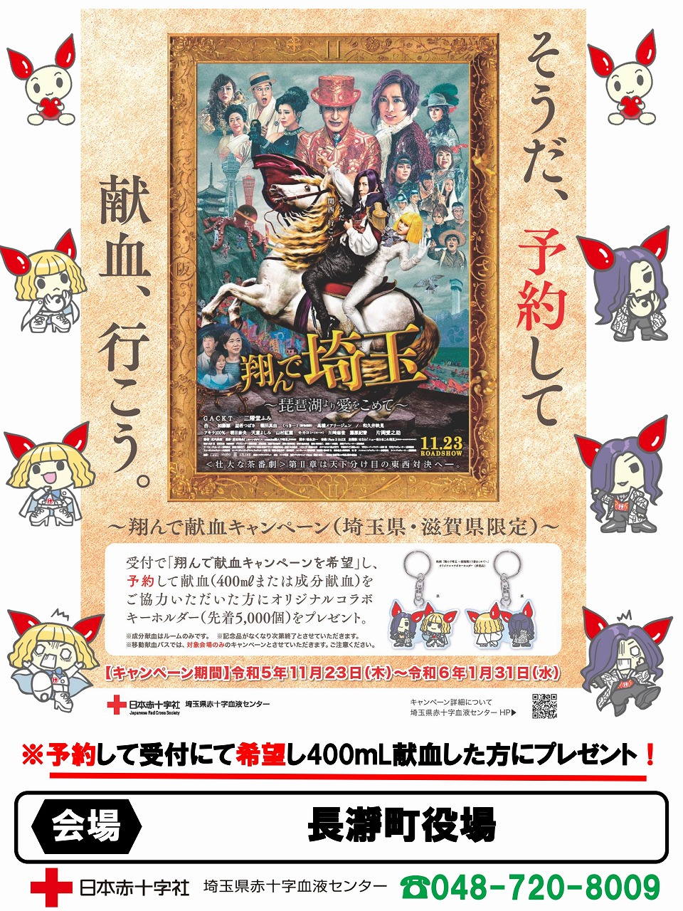 献血にご協力された方に「翔んで埼玉」オリジナルコラボキーホルダーをプレゼント!!詳しくは下のチラシをクリック👇