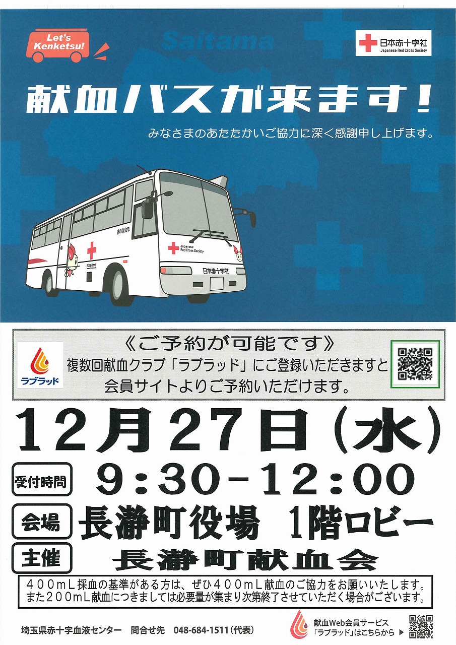 献血バスのお知らせです。来る12月27日(水)、長瀞町役場一階ロビーに献血バスが来ます。受付時間は09:30~12:00までです。