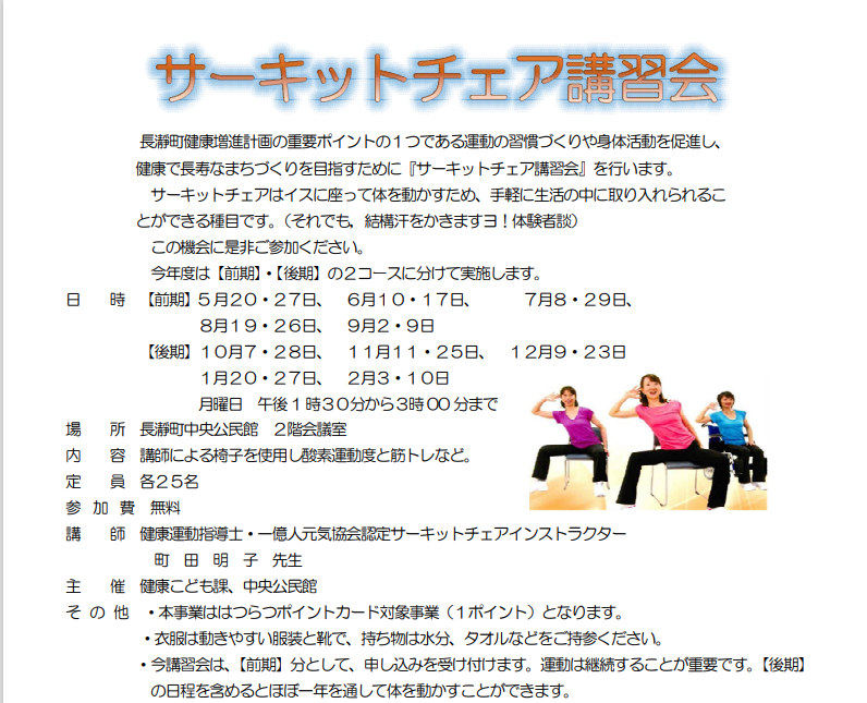 長瀞町では、長瀞町健康増進計画の重要ポイントの1つである運動の習慣づくりや身体活動を促進し、健康で長寿なまちづくりを目指すために『サーキットチェア講習会』を行います。