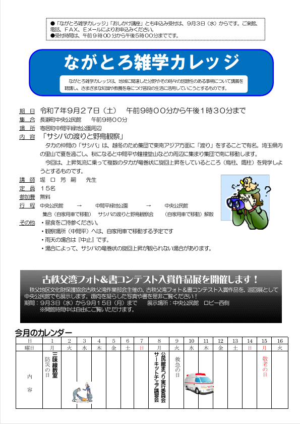 さらに、ながとろ雑学カレッジより9月27日(土)開催『サシバの渡りと野鳥観察』。