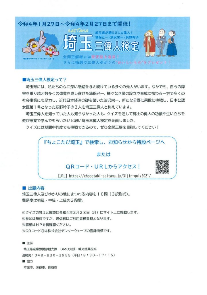 こんにちは!本日は【埼玉三偉人検定】のお知らせです!!