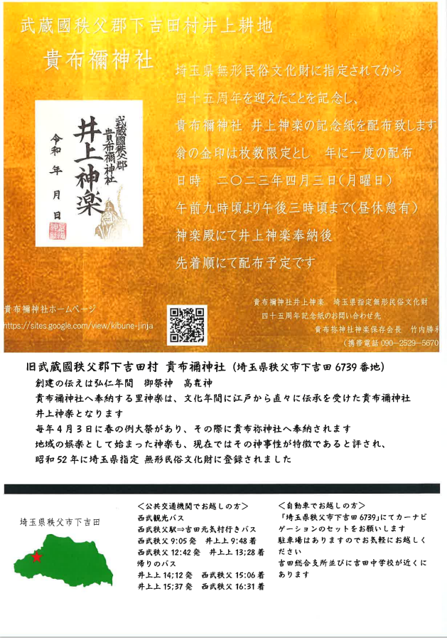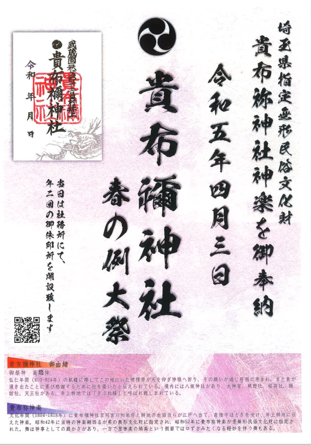 文化財保護法の改正を経て、昭和五十二年に貴布祢(きふね)神社神楽が埼玉県の無形民俗文化財へ指定され