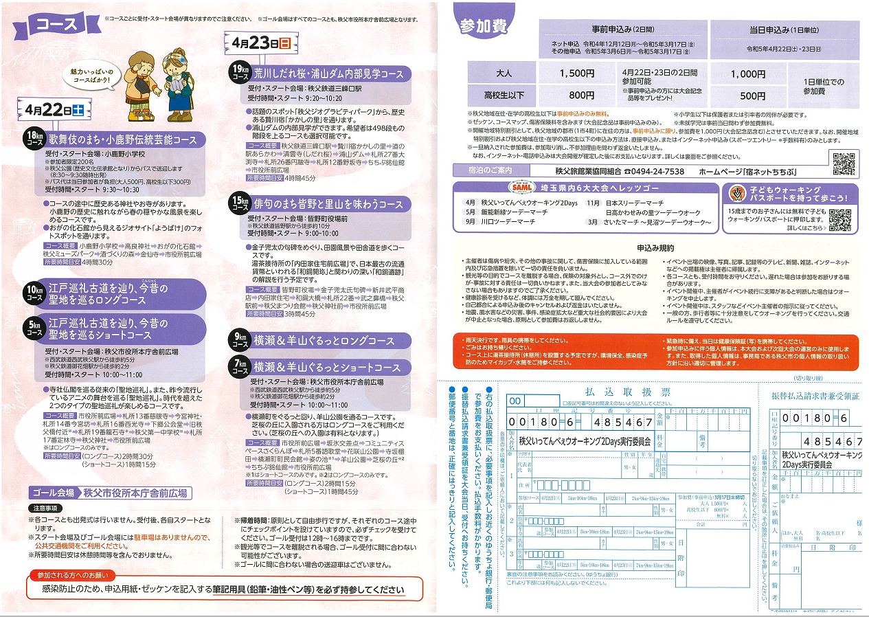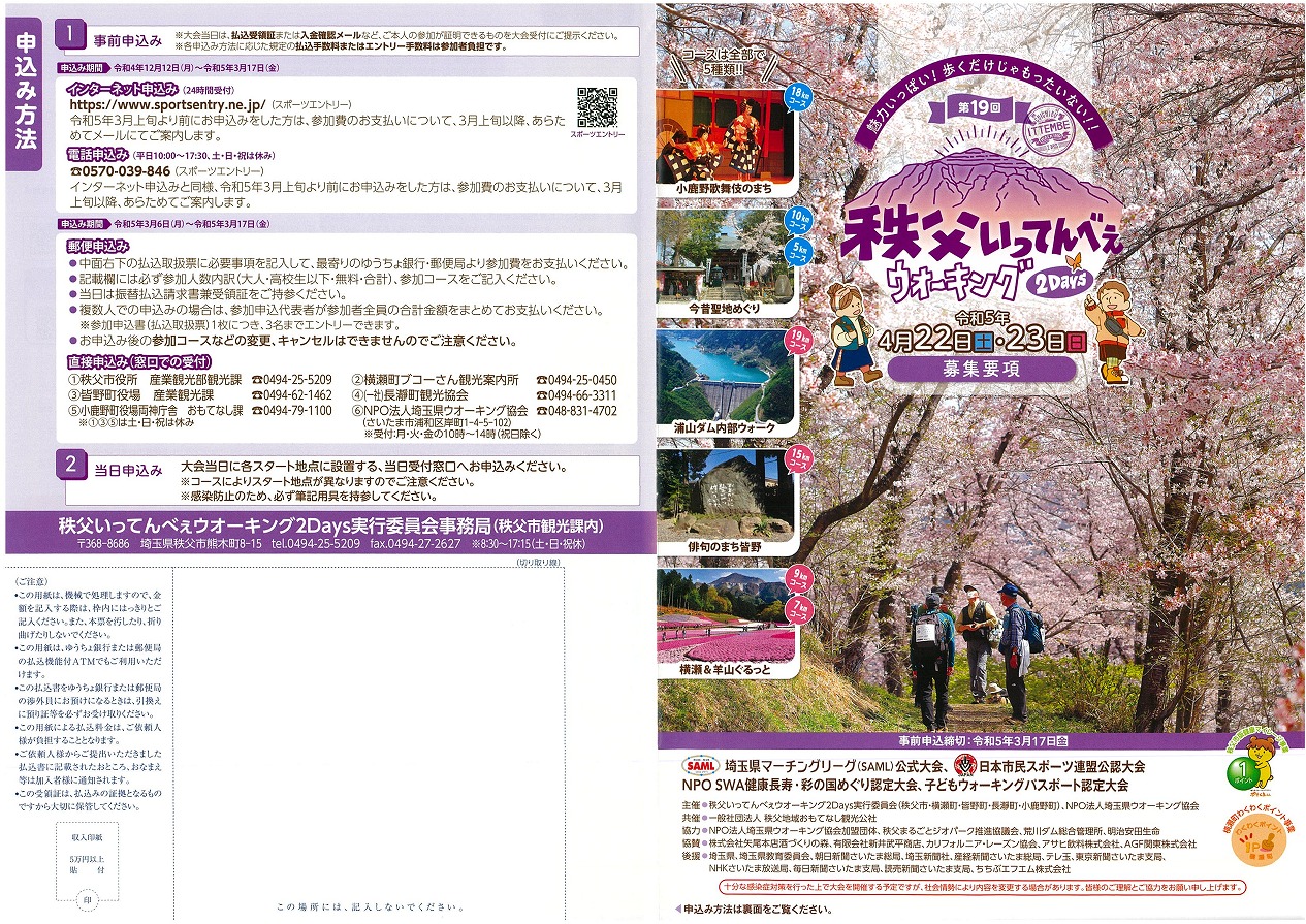 令和5年4月22日㈯、23日㈰に開催予定の「第19回秩父いってんべぇウォーキング2Days」ですが、