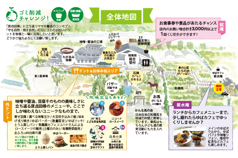 敷地内には、「直売店 糀庵」「ゆばカフェ 紫水庵」などの施設のほか、