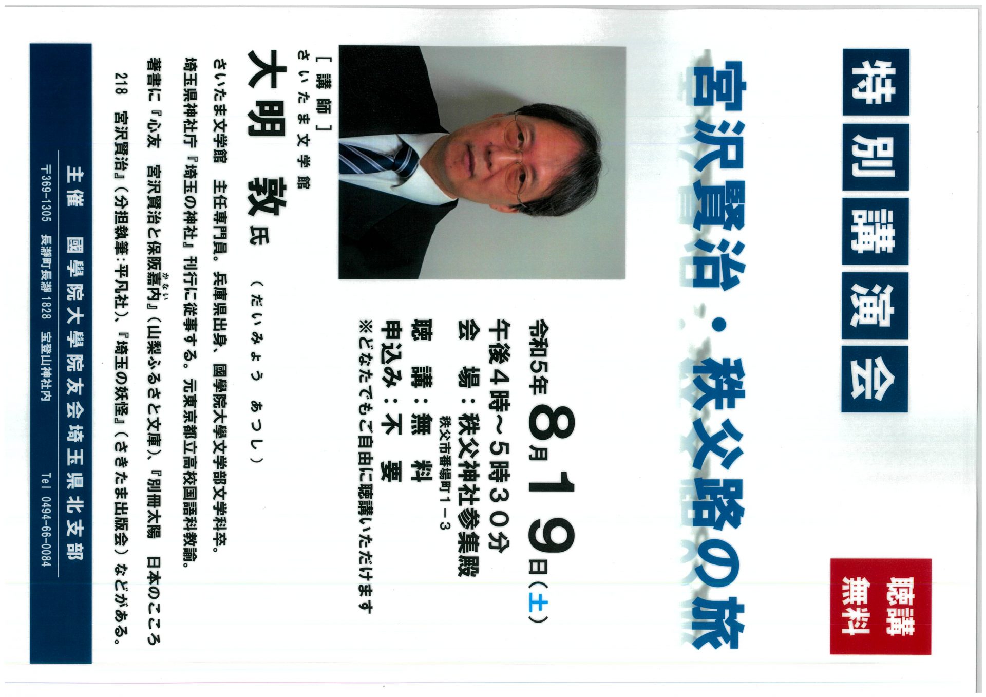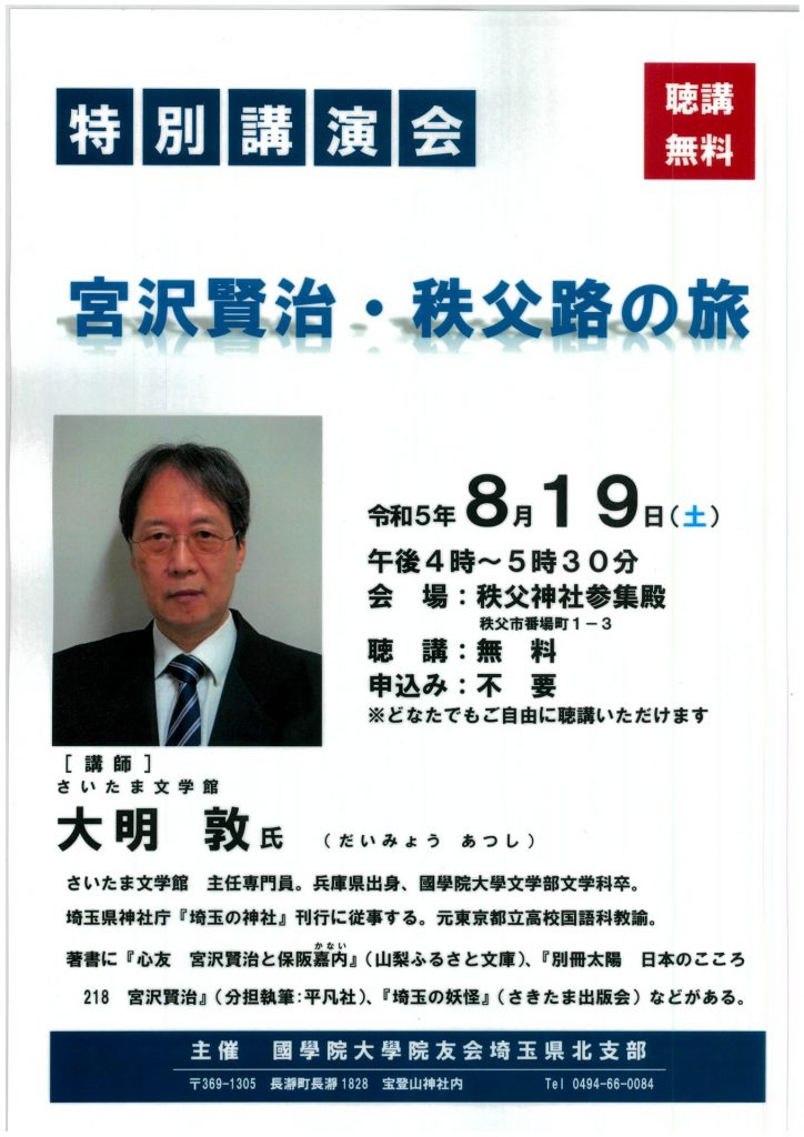 國學院大學院友会埼玉支部では、8月19日に大明敦氏を講師にお迎えし、特別講演会を秩父神社参集殿にて実施いたします。ご興味のある方は、聴講無料ですので、是非、ご参加してみてください。詳しくは下記のチラシをご覧ください。