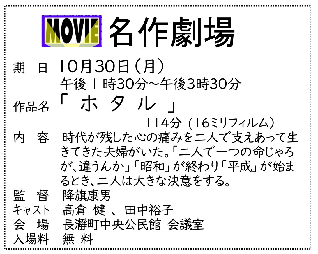 皆さんこんにちは!今日は、10月30日に開催される、長瀞町中央公民館の名作劇場のご紹介です😄