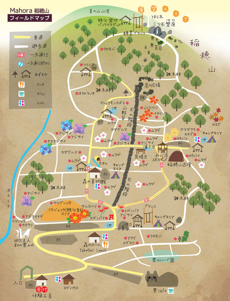 「Mahora稲穂山」の看板がありますので、ここを目印に左折し、道なりに進んでいくと到着します。