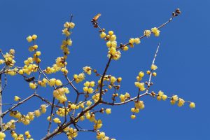 ロウバイの黄色い小さな花からは、甘い香りが漂ってきます。