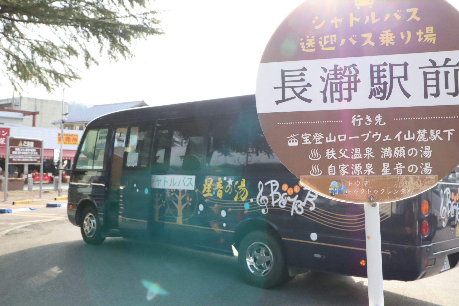 シャトルバス乗り場は、長瀞駅(駅前ロータリー)と、皆野駅(五野上薬局さん向かい)にあります。