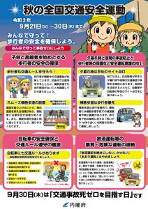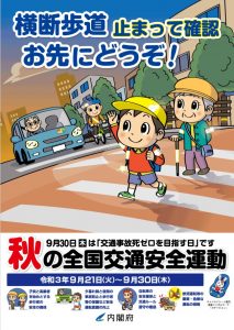 本日(令和3年9月21日)より、「秋の全国交通安全運動」が始まりました!
