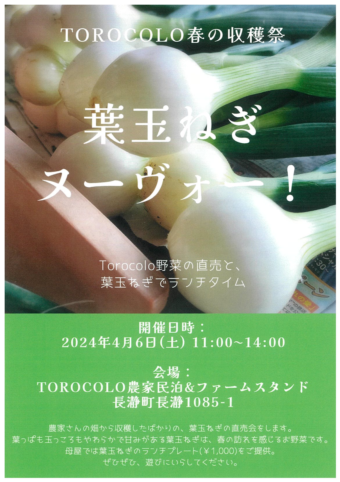 この度、収穫したばかりの葉玉ねぎの直売会をします!!!生き生きとした葉、柔らかで甘みのある葉玉ねぎは、春の訪れを感じさせてくれます。新鮮な野菜をいただいて素敵なランチタイムを過ごしませんか?(*´▽`*)