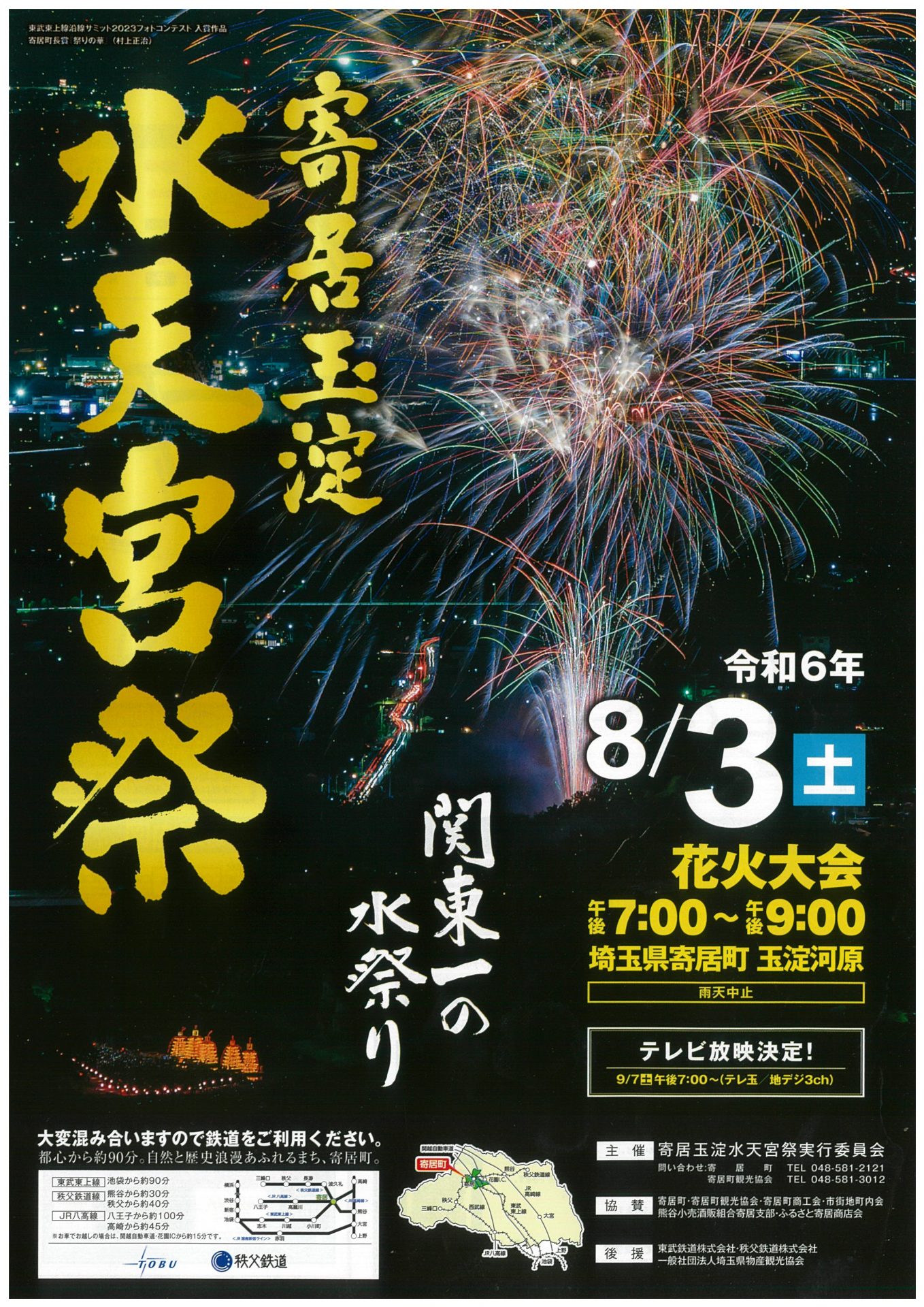 寄居町にある天然の名勝地『玉淀』に、各町内からボンボリや提灯で美しく飾りたてた舟山車が数隻参加して、城山をバックに打ち上げられる大花火と川面に生える万灯の饗宴が開催されます。関東一と呼ばれる水祭りです😊8月3日(土)、どうぞお越しくださいませ!